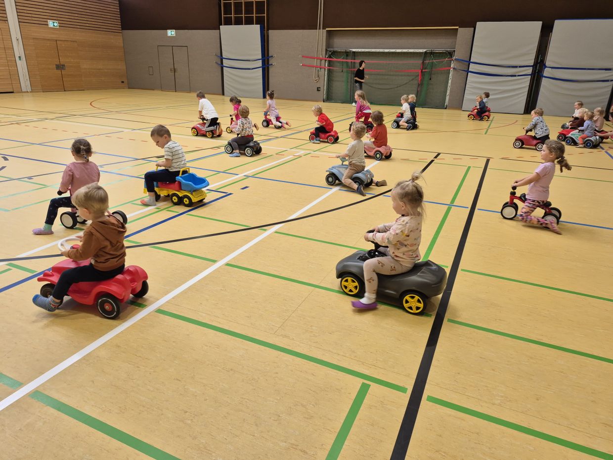 In der vergangenen Woche drehte sich beim Kinderturnen alles rund ums Thema „Rennfahrer“. Jedes Kind der Eltern-Kind Gruppen sowie von den Pinguinen und Eisbären brachte sein eigenes Bobby-Car oder seinen Roller mit in die Halle – selbstverständlich mit frisch geputzten Reifen!