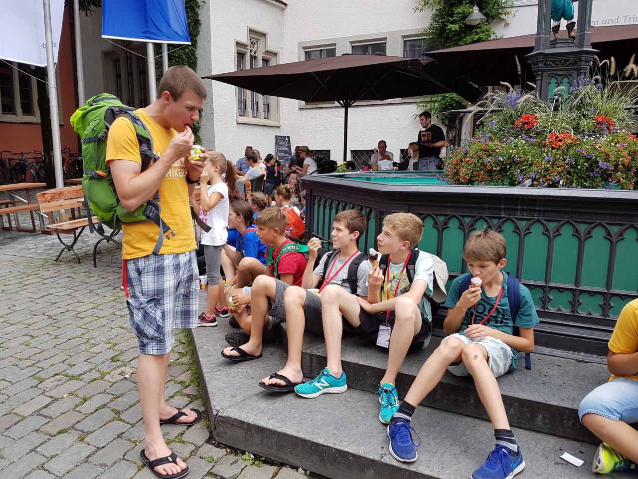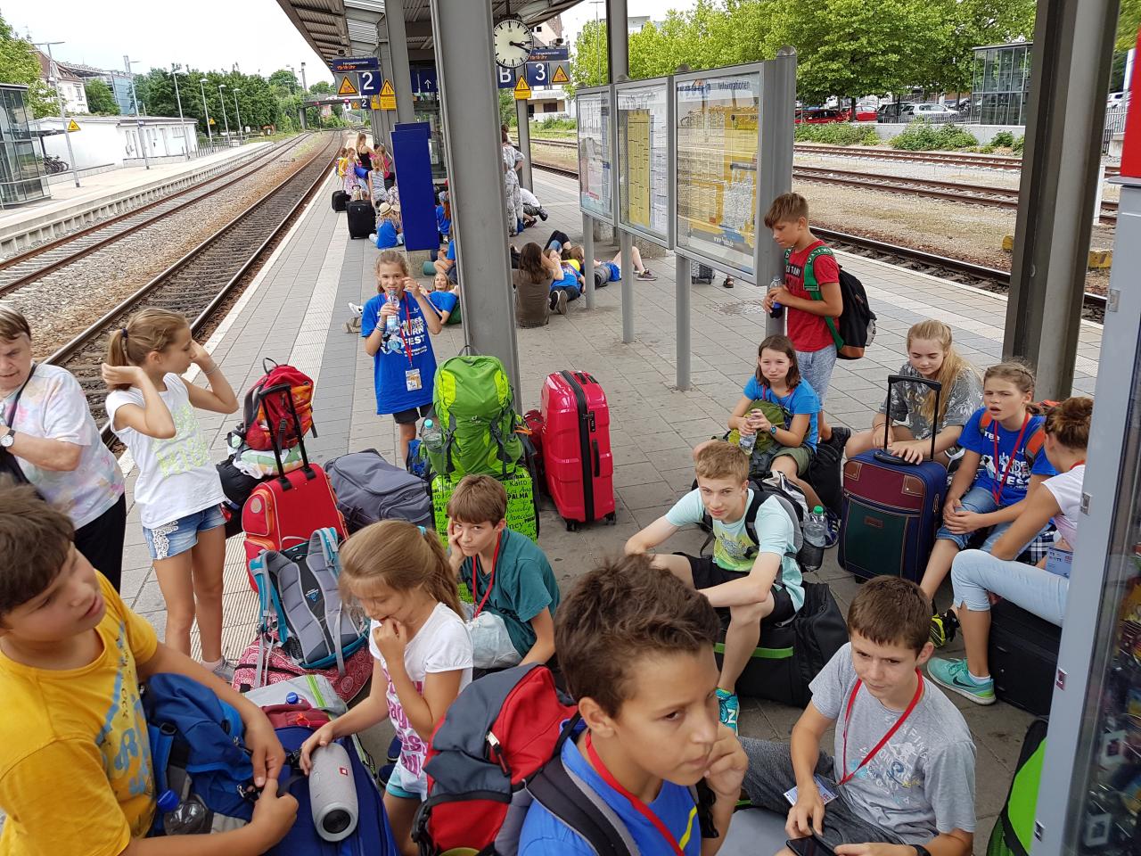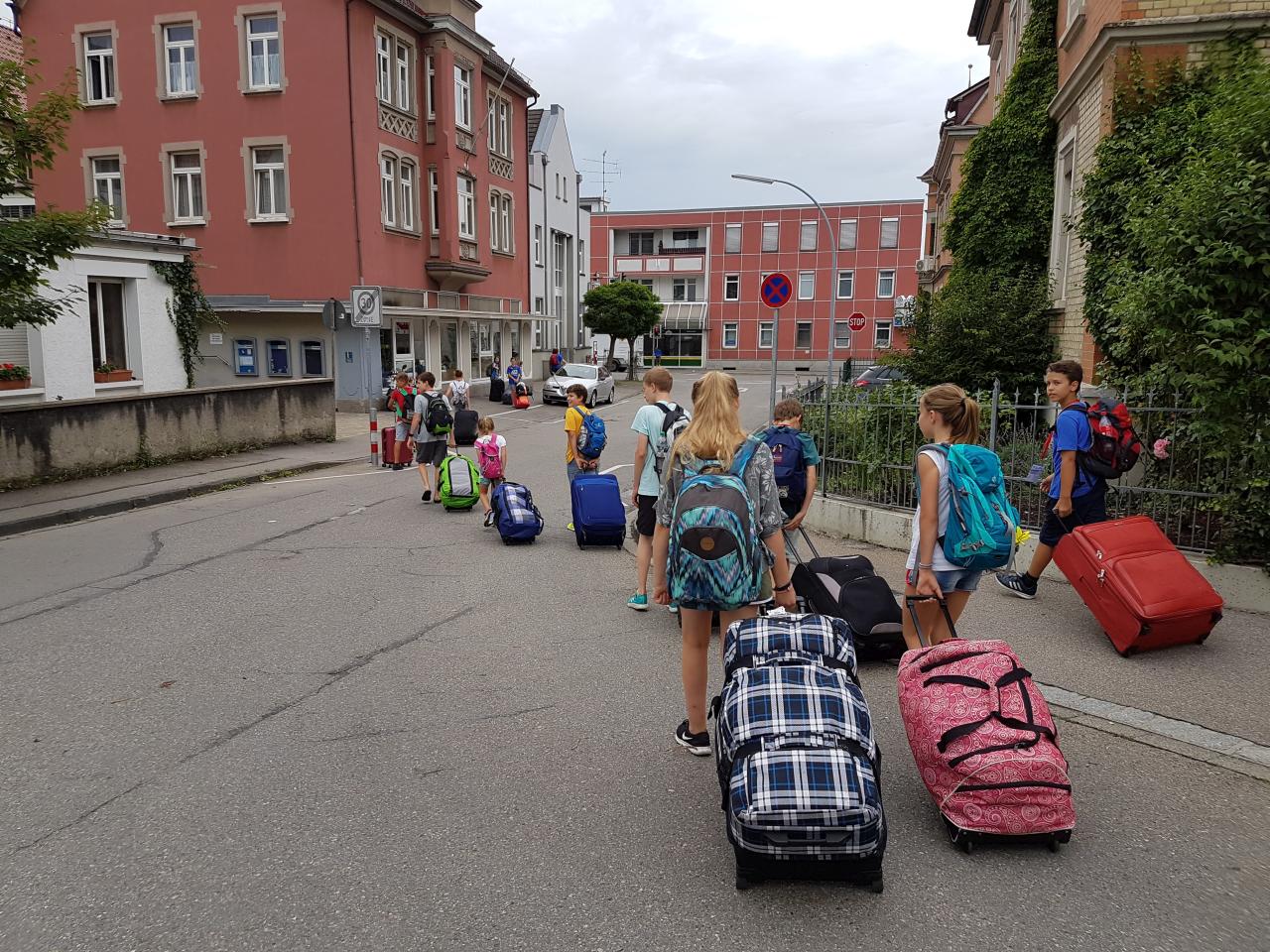 Nachdem unser Zug in Bietigheim fast pünktlich abgefahren ist, zogen wir unser Gepäck in Stuttgart angekommen schnell Richtung Anschlusszug. Am neuen Bahnsteig mussten wir je-doch feststellen, dass viele andere das gleiche Ziel hatten und der Zug bereits überfüllt war. Wir durften dann mit dem ICE, auf dem Boden sitzend, bis Ulm fahren. Dort ging es über Aulendorf weiter bis Ravensburg, wo wir um 18.30 Uhr völlig verschwitzt ankamen. Nachdem wir unser Gepäck in die Schule gebracht hatten, gingen wir Richtung Marktplatz zur bereits begonnenen Eröffnungsparty. Den Tag ließen wir danach gemeinsam in der Schule ausklingen.