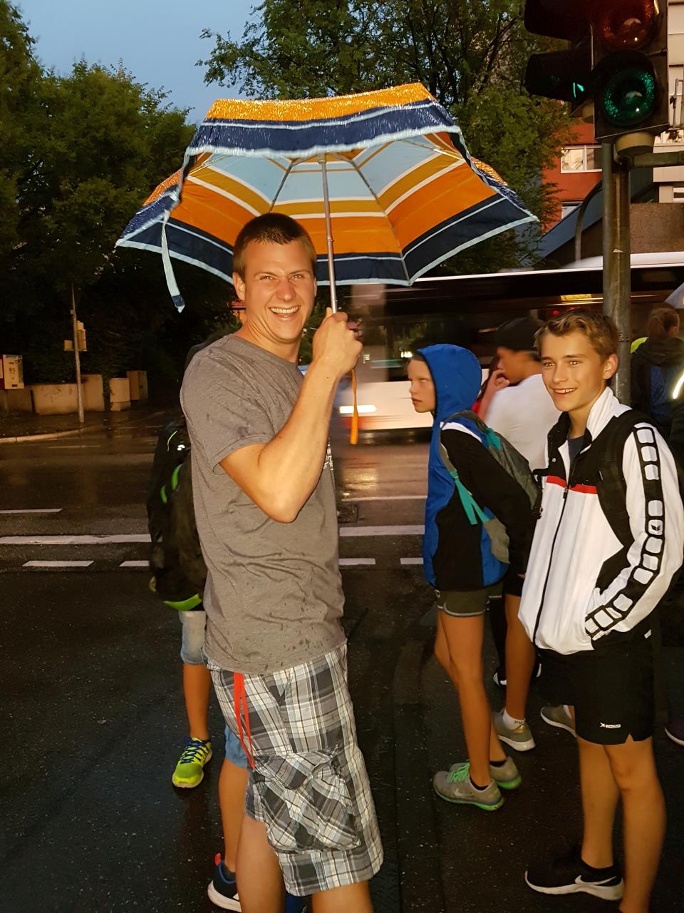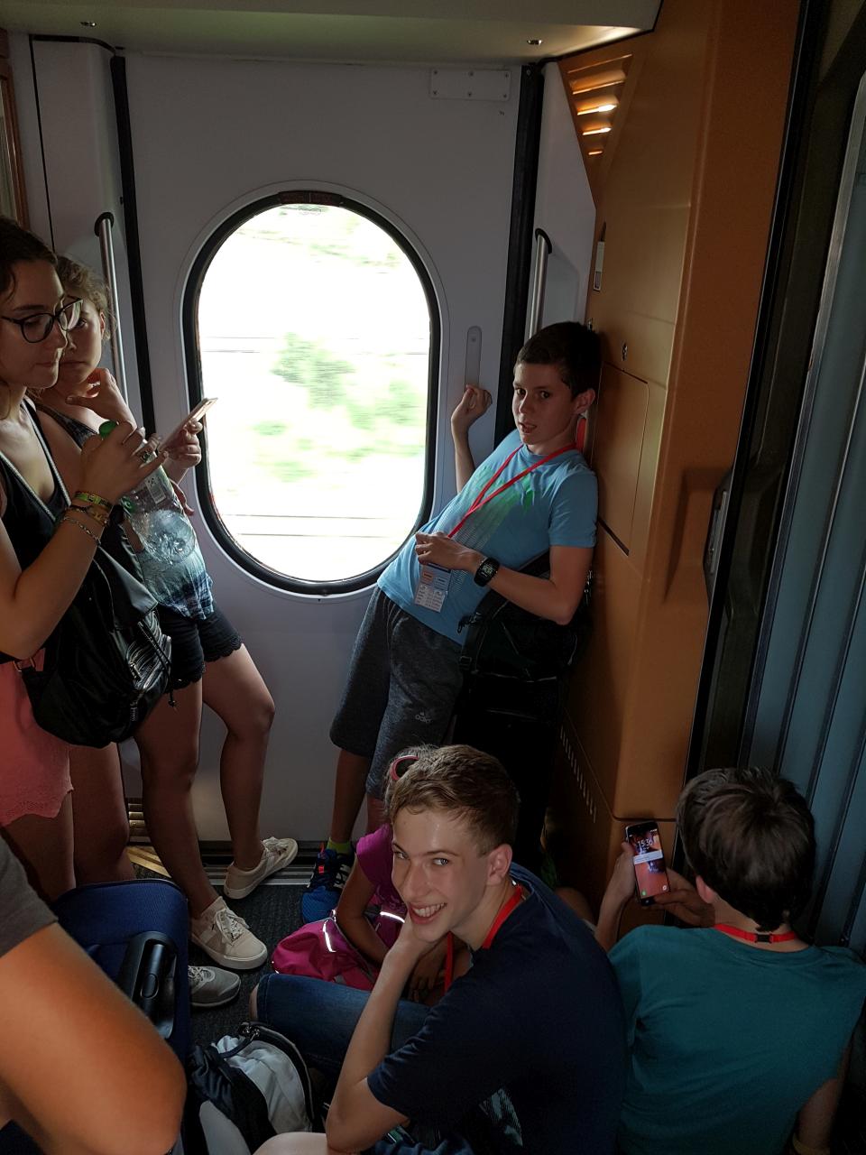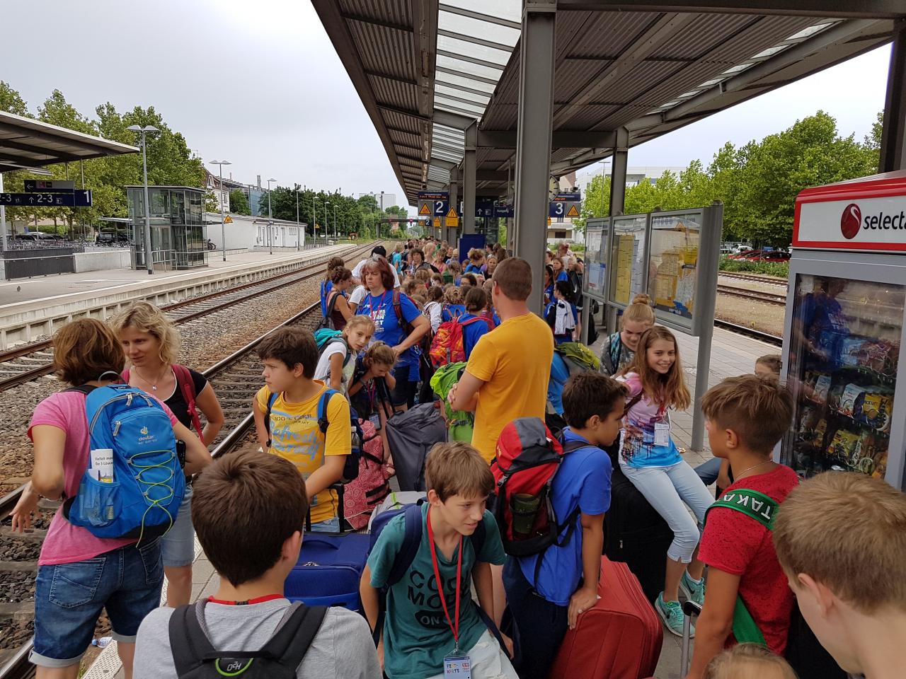 Nachdem unser Zug in Bietigheim fast pünktlich abgefahren ist, zogen wir unser Gepäck in Stuttgart angekommen schnell Richtung Anschlusszug. Am neuen Bahnsteig mussten wir je-doch feststellen, dass viele andere das gleiche Ziel hatten und der Zug bereits überfüllt war. Wir durften dann mit dem ICE, auf dem Boden sitzend, bis Ulm fahren. Dort ging es über Aulendorf weiter bis Ravensburg, wo wir um 18.30 Uhr völlig verschwitzt ankamen. Nachdem wir unser Gepäck in die Schule gebracht hatten, gingen wir Richtung Marktplatz zur bereits begonnenen Eröffnungsparty. Den Tag ließen wir danach gemeinsam in der Schule ausklingen.