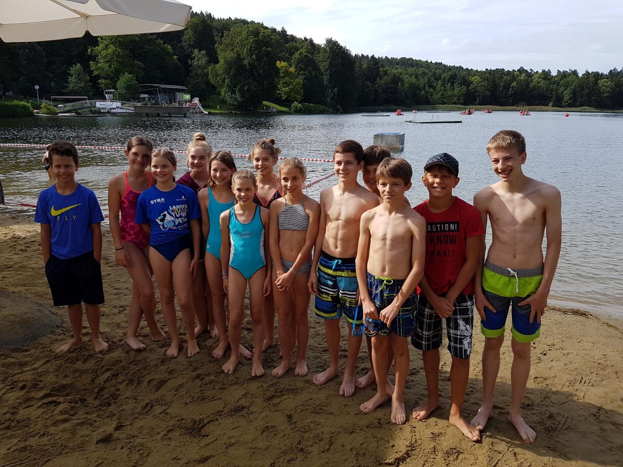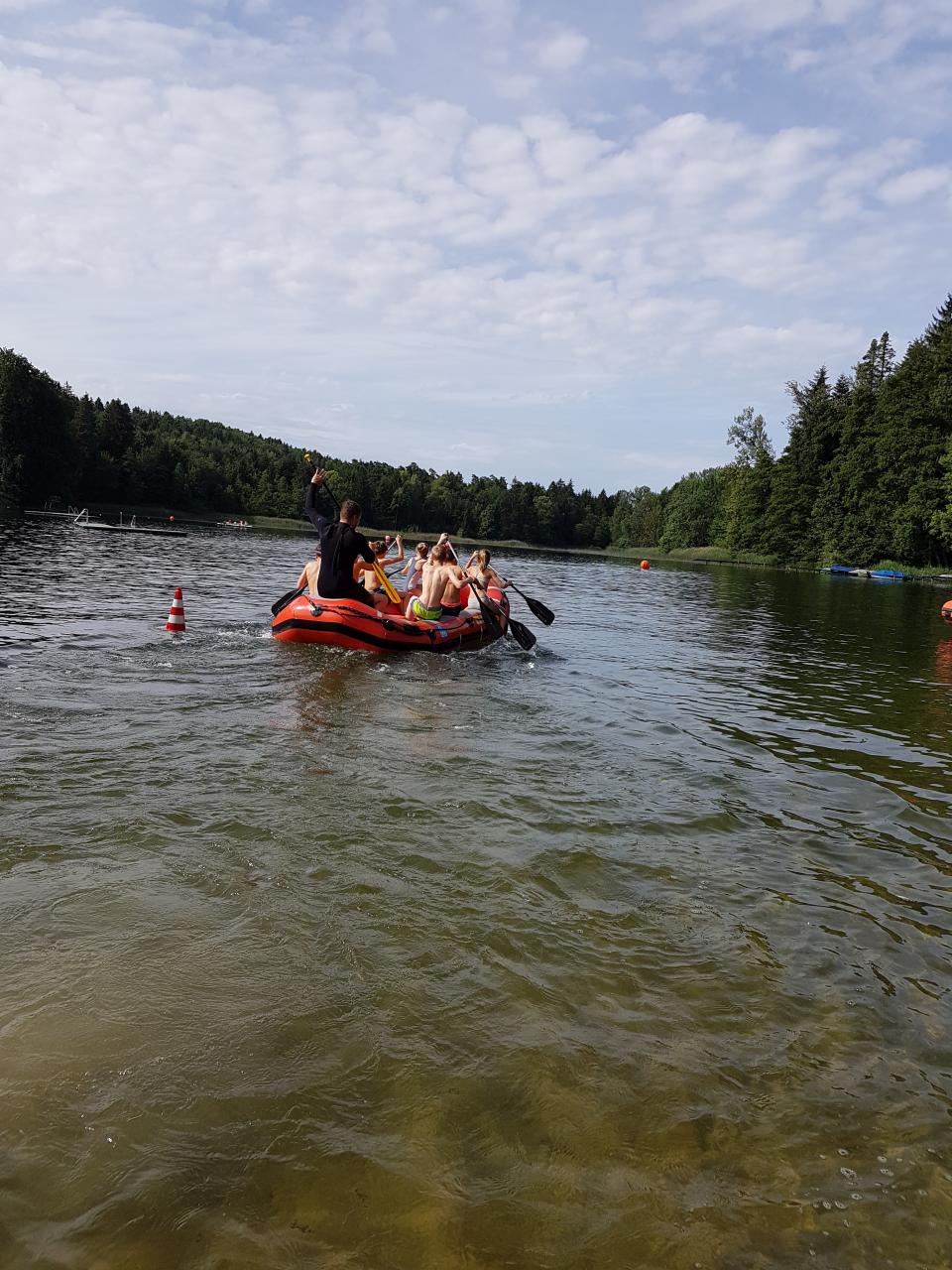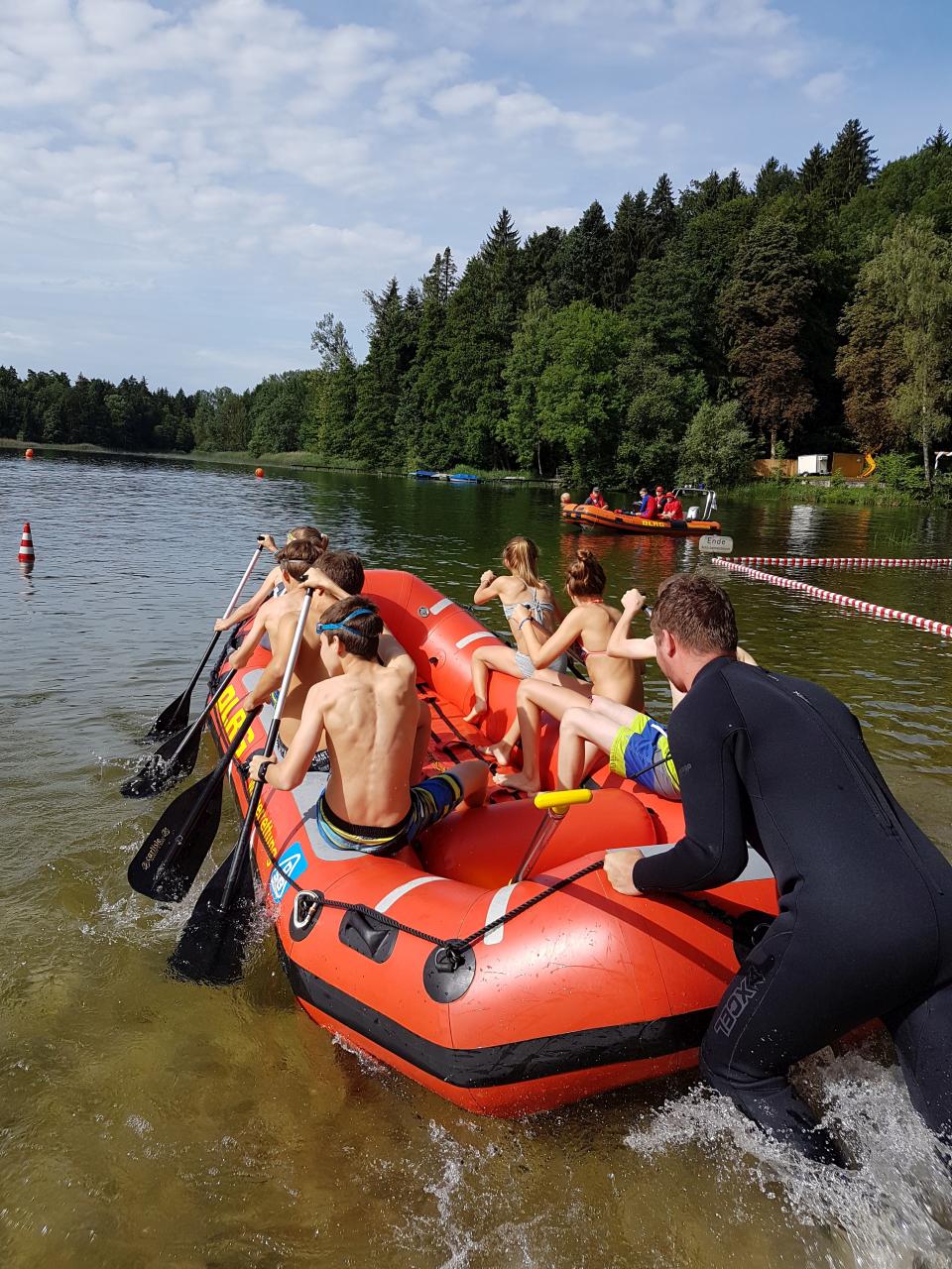 Am Sonntagmorgen starteten wir mit zwei Mannschaften beim besonderen Wettkampf. Hier mussten zuerst 200 Meter gepaddelt, danach ca. 50 Meter zum Ufer geschwommen und zum Schluss noch 150 Meter ins Ziel gelaufen werden. Beide Mannschaften haben das super gemacht und sind beinahe zeitgleich auf dem 12. bzw. 13. Platz ins Ziel gekommen.