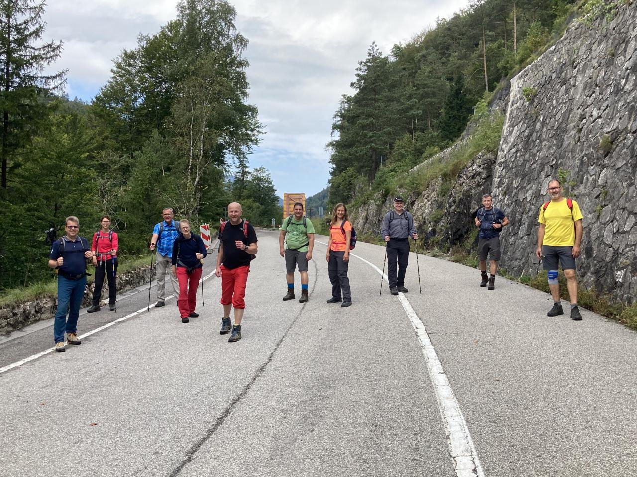 Beim Frühstück am Samstag gab es noch skeptische Blicke auf die Prognose der Wetter-Apps und auch der Blick aus dem Fenster ließ eher auf einen feuchten Tag schließen. Doch schon bei der Abfahrt zeigte sich die Sonne und so startete man gutgelaunt zur anstehenden Tageswanderung. Start war ein Parkplatz am Thumsee. Auf Etappe eins “Natur und Technik" führte uns der Salinenweg an der ersten Pipeline der Welt, einer Soleleitung von Bad Reichenhall nach Traunstein, entlang. Immer wieder sah man neben den schönen Waldwegen noch Überreste der alten Leitung und Infotafeln zeigten, welche Bedeutung der Bau der Pipeline für die Region damals hatte. Die zweite Etappe “Natur pur“ führte uns auf schmalen Wegen, über Stege und Stufen durch die imponierende Weißbachschlucht. Das Rauschen des Wildwassers und der Wasserfälle war allgegenwärtig. Als man eine, in einem starken Wasserstrudel um ihr Leben kämpfende Kröte entdeckte, fackelten drei mutige Männer der Gruppe nicht lange und “Unkerich“ wurde gerettet. Nach dem Ausstieg aus der Weißbachschlucht wurde eine kurze Vesperpause eingelegt. Etappe drei “Natur und Aussicht“ konnte gestartet werden. Die beim Vesper vorgenommene Umverteilung des Gewichts von hinten im Rucksack nach vorne in den Bauch war eine wichtige Voraussetzung, um den langen steilen Aufstieg zur Höllenbachalm zu bewältigen. Nach einer kurzen Rast an der Höllenbachalm führte unser Weg zurück über den Bergrücken des Hochrießel Richtung Thumsee. Bei herrlichen Ausblicken hinüber nach Bad Reichenhall, auf die umliegenden Berge und bis hinunter zum See war der Rückweg zum Parkplatz ein Leichtes. Zurück in der Unterkunft wurde von freiwilligen Köchen der Gruppe ein internationales 3-Gänge Menü zubereitet. Der Rest konnte derweil im Wellnessbereich die Muskeln entspannen.