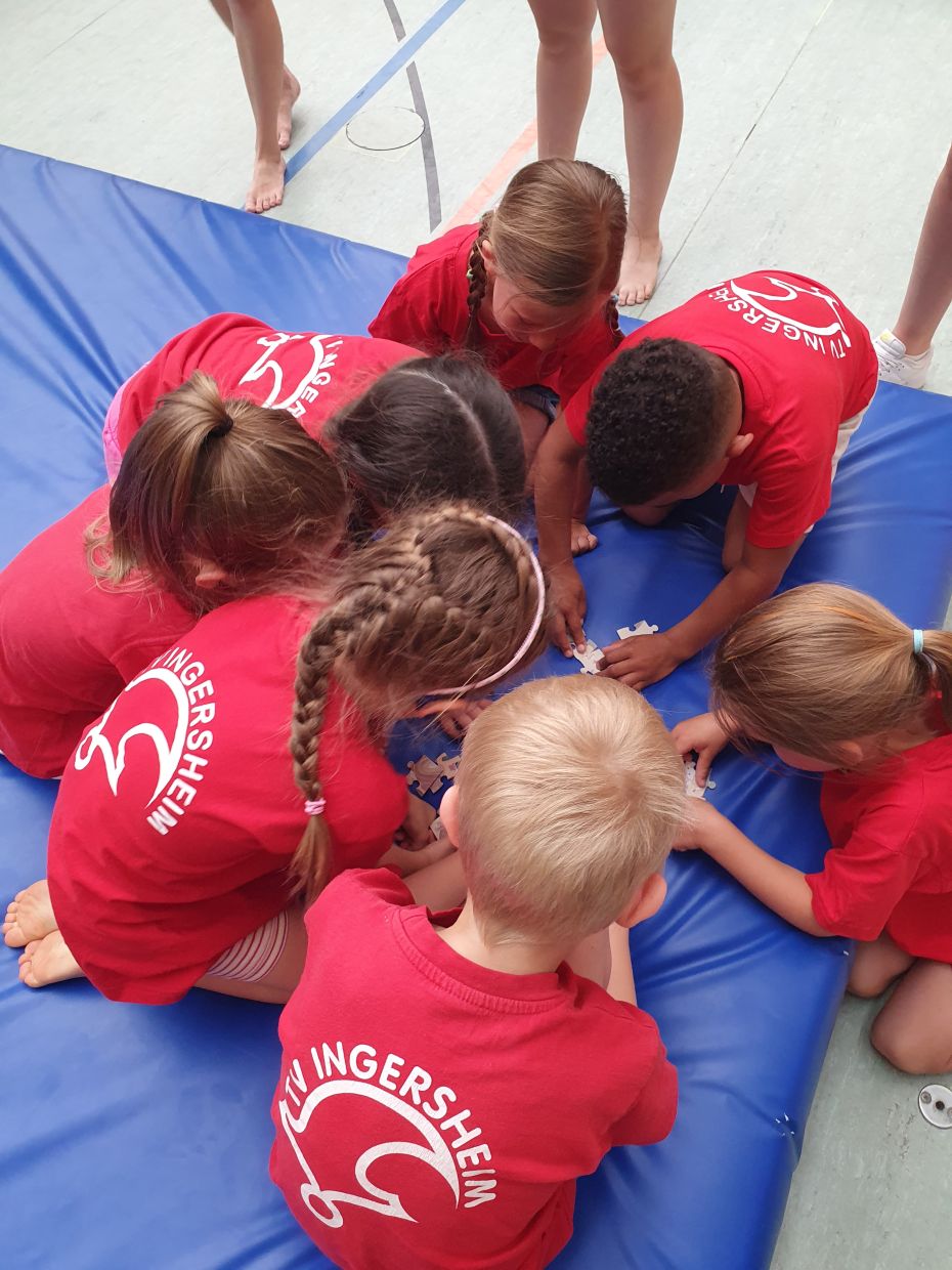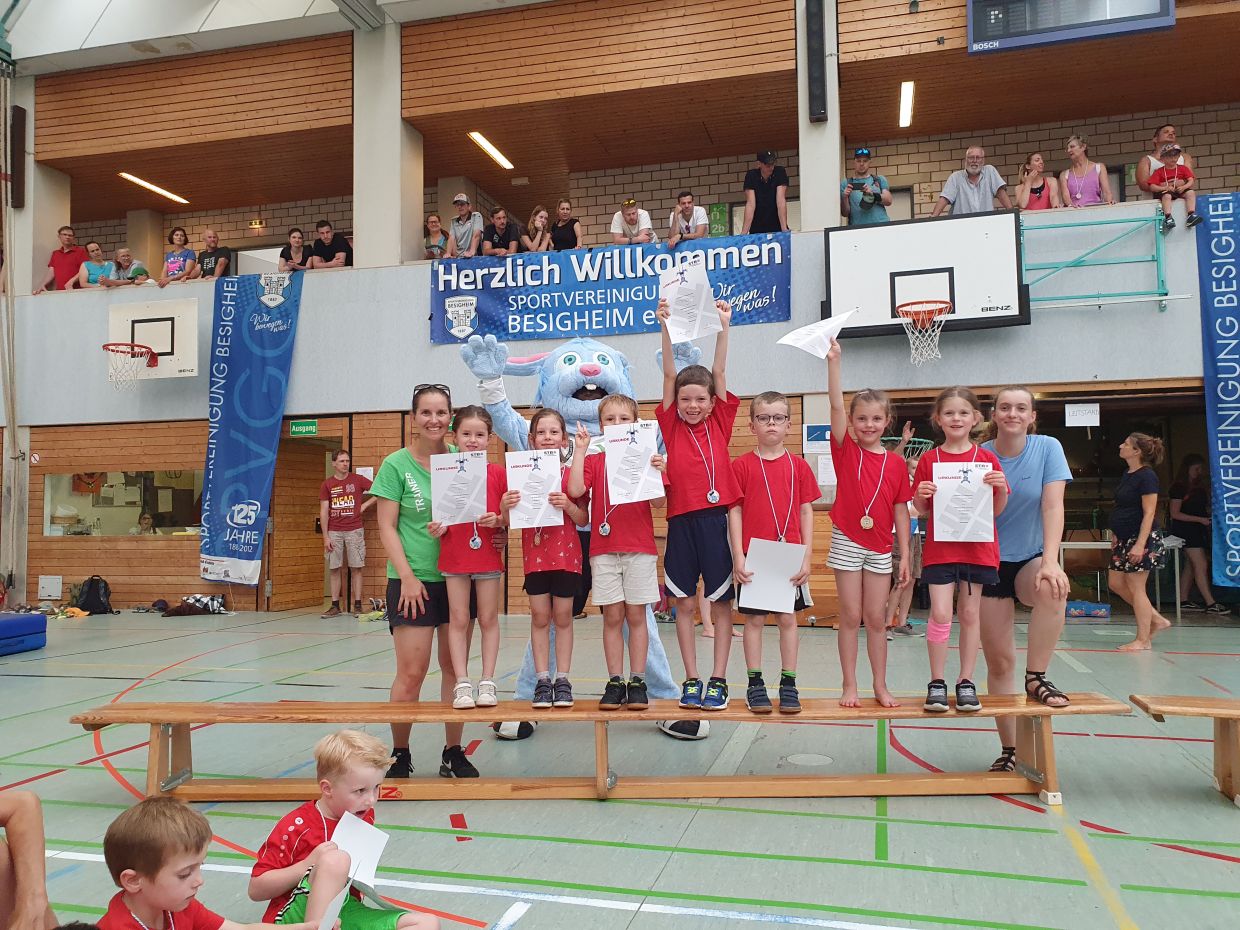 So mussten die Turnminis zum Beispiel eine Hügellandschaft von Schneewittchen und den sieben Zwergen überqueren und dabei Sandsäckchen einsammeln, bei Sterntaler die Sterne pflücken oder den engen Wald von Hänsel und Gretel durchlaufen. Die Turnmaxis erklommen zum Beispiel bei den Bremer Stadtmusikanten eine größere Hügellandschaft und mussten anschließend ein Puzzle lösen oder mussten in einem Staffellauf so schnell wie möglich das Tischlein decken. Anschließend blieb noch etwas Zeit für die angebotenen Mitmachstationen, bevor es dann zurück in die Halle zur Siegerehrung ging. Alle Kinder bekamen ihre wohlverdienten Urkunden und Medaillen. Die beiden Mannschaften der Turnmaxis schlossen den Wettkampf mit „Spitze“ und „Superspitze“ ab. Glücklicherweise war in diesem Jahr wieder Turni dabei, sodass wir ein Gruppenbild mit ihm machen konnten. Vielen Dank an die SpVgg Besigheim für den tollen Wettkampf und an alle Übungsleiterinnen für ihre Unterstützung.