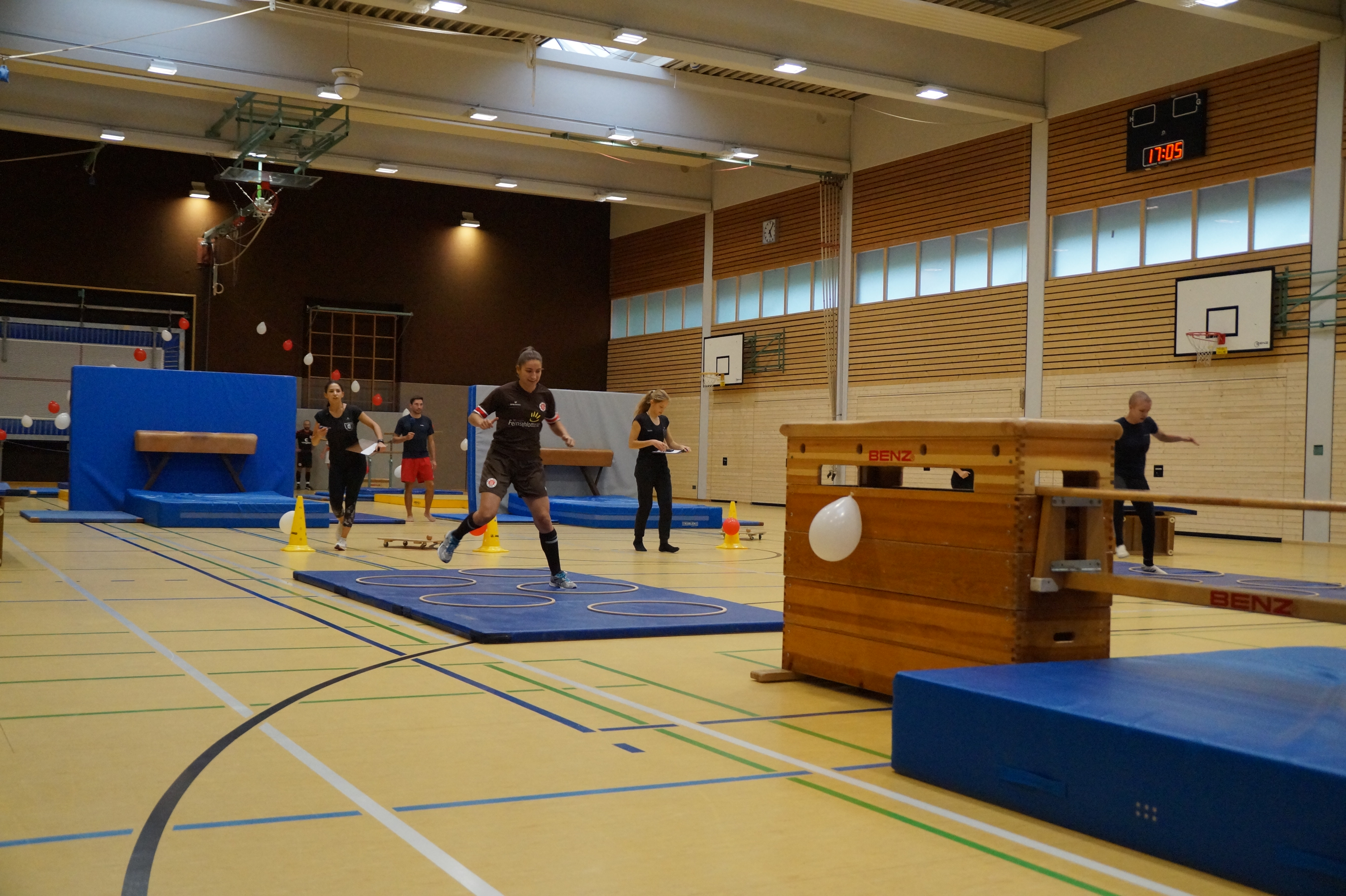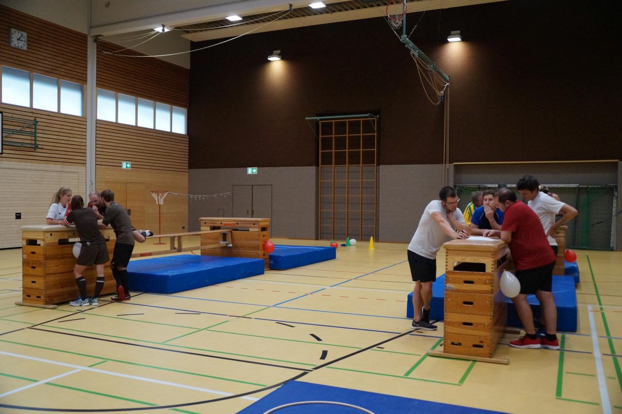 Elf Mannschaften mit je vier Mitgliedern verteilten sich zum Start in der Halle um den Geräte-Parkour und versuchten die Quizfragen zu lösen. Danach probierten sich die 44 Starterinnen und Starter in der Einturnphase im Parkour.