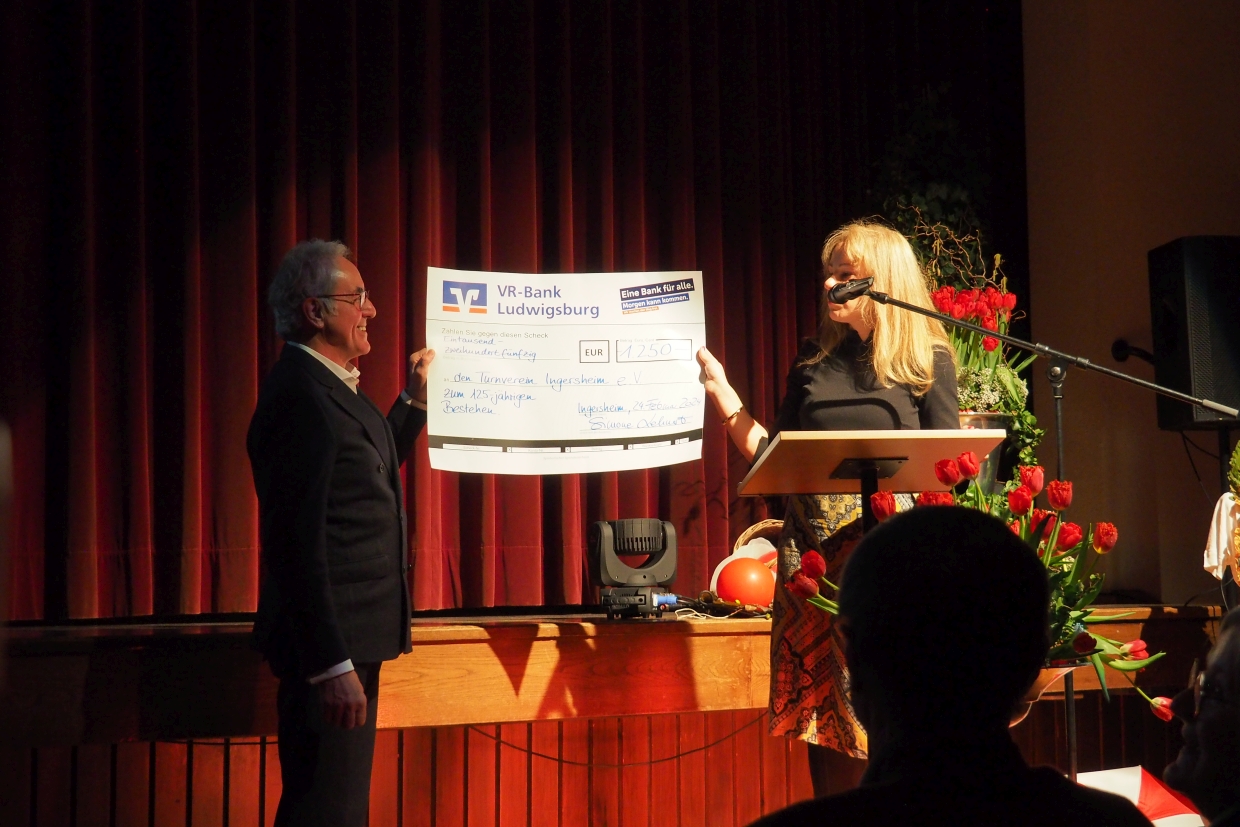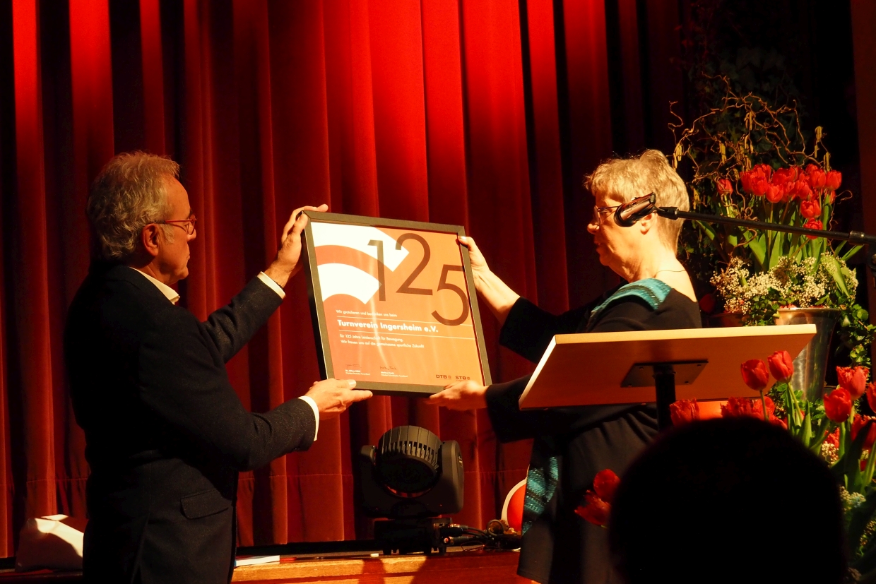 Die Moderatoren nannten dem Publikum alle anstehenden Jubiläumsveranstaltungen und wiesen dabei auf die Zusammenarbeit mit der Gemeinde hin und bedankten sich für die bisherige gute Kooperation. Die Ingersheimer Bürgermeistern Simone Lehnert kam daraufhin an das Rednerpult und überbrachte ebenfalls Glückwünsche zum 125-jährigen Bestehen. Sie wies auf den großen Einfluss des Turnvereins in der Gemeinde hin und bedankte sich für den Beitrag des Vereins zum Gemeindeleben mit einem Spendenscheck. Die Kindergruppe der Gerätturnerinnen und Gerätturner, die bereits bei der Turngala im Januar ihren Auftritt hatten, zeigten anschließend nochmals ihre Tanzaufführung. Anschließend richtete der Präsident des Schwäbischen Turnerbundes Markus Frank seine Grußworte an das Publikum und lobte den TVI für dessen Engagement. Auch Matthias Müller (Präsident des Sportkreises Ludwigsburg) und Bärbel Vorrink (Präsidentin des Turngau Neckar-Enz) gratulierten dem TVI zum Jubiläum und überbrachten Präsente, sowie eine Urkunde und ein entsprechendes Fahnenband.