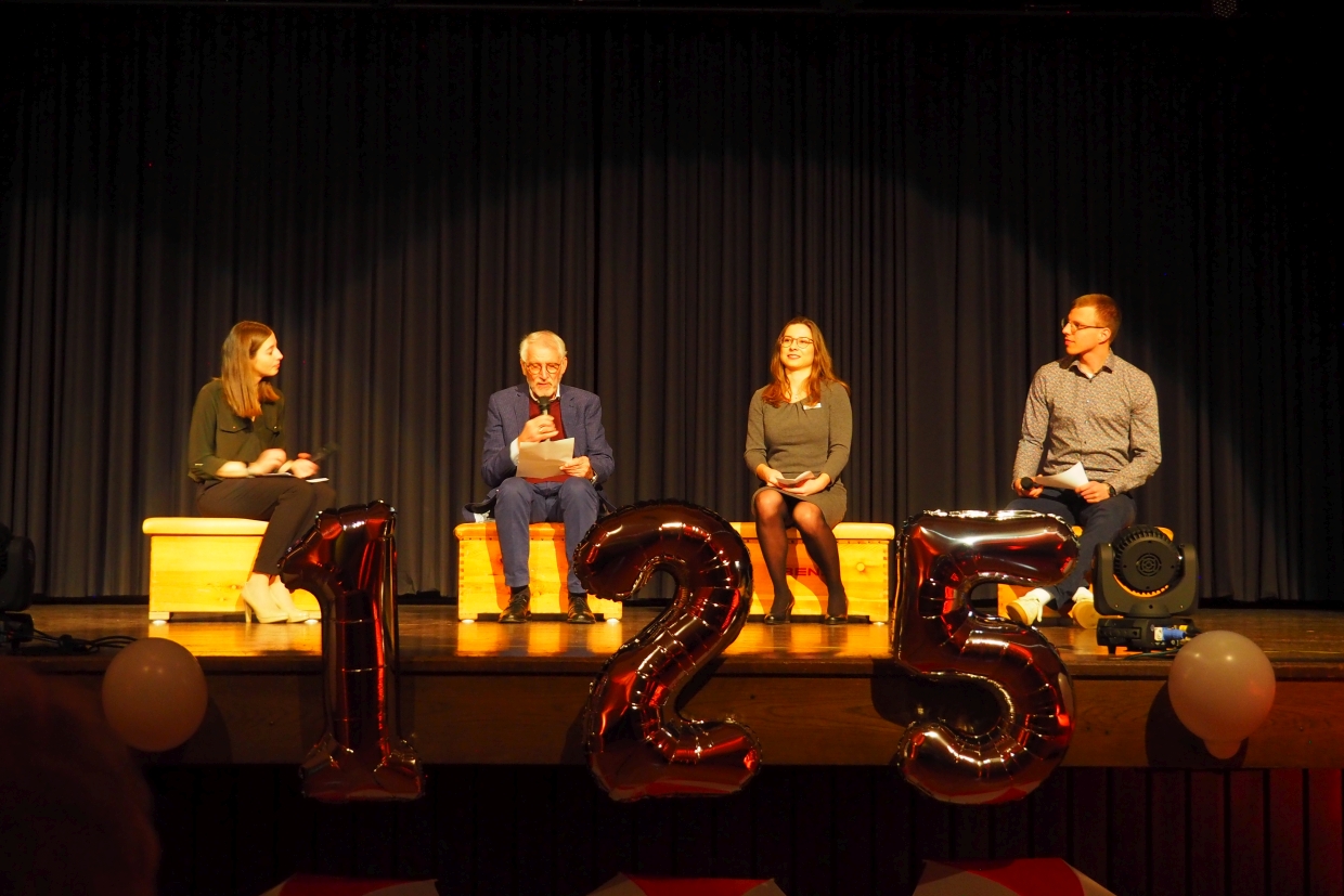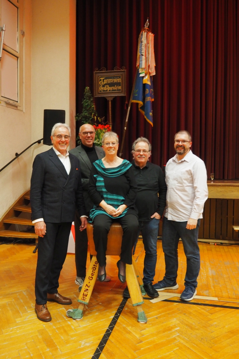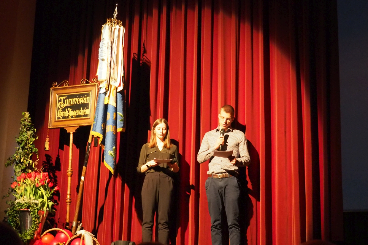 Sina Nägele und Jannis Noé hießen nach ihrem wortwörtlichen „Sprung“ inklusive Salto alle Anwesenden herzlich willkommen und führten anschließend als Moderationsduo durch das Programm. Den Auftakt machte Vereinsvorstand Joachim Rösch und versprach allen ein vielseitiges und spannendes Jubiläumsjahr. Er fasste die Vereinsgeschichte, die bis auf das Jahr 1899 zurückgeht, kurz zusammen bevor an Highlights in den letzten Jahrzehnten verwies. Der Vorsitzende des Turnvereins aus der Partnergemeinde (SSSAI) Pierre Eschbach schloss sich der Rede von Joachim Rösch an und überbrachte Glückwünsche und ein kleines Geschenk aus Ingersheim im Elsass. Die Tanzgruppe „El Somina“ zeigte daraufhin zur Auflockerung einen Tanz mit verschiedenen Fitnessgeräten.