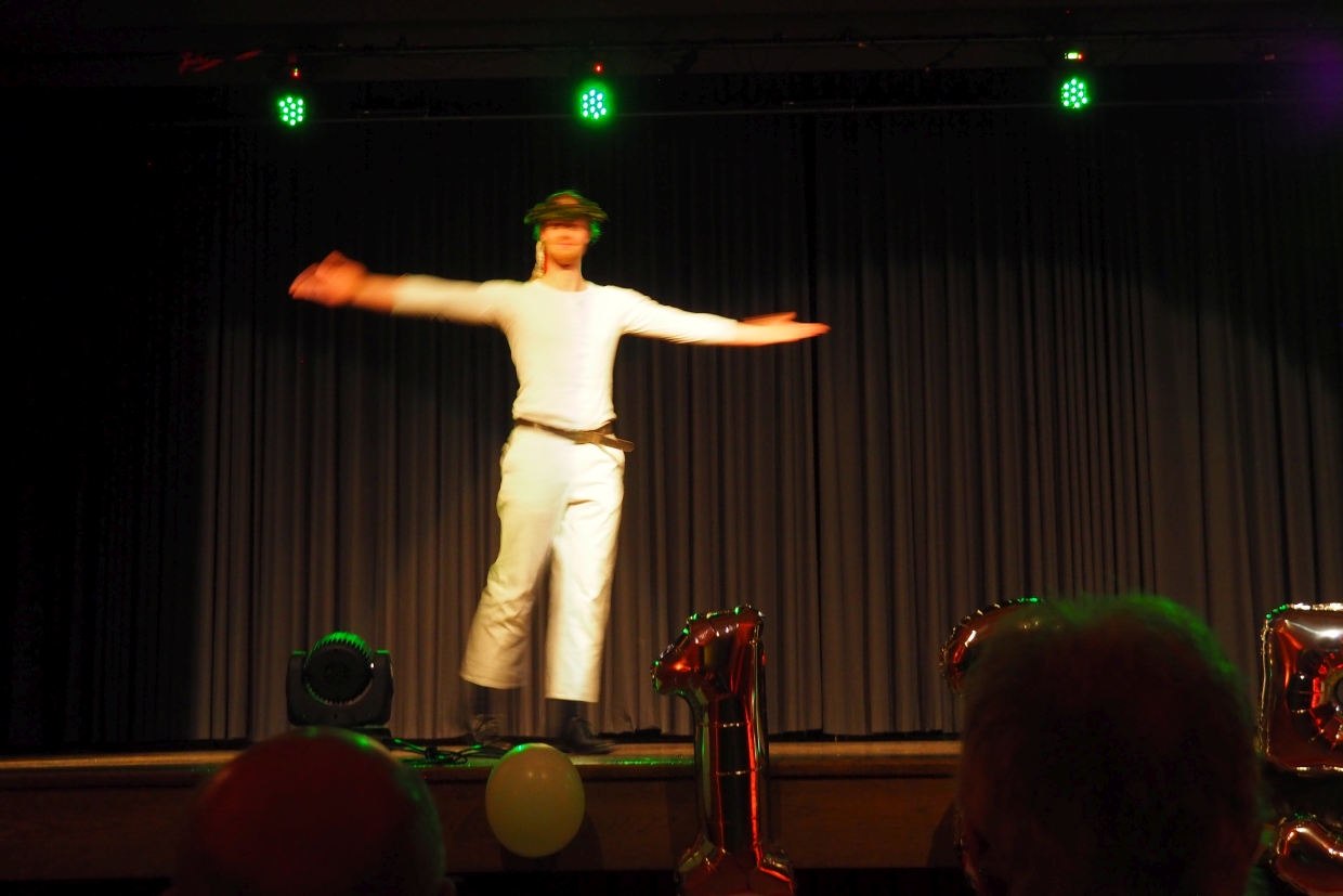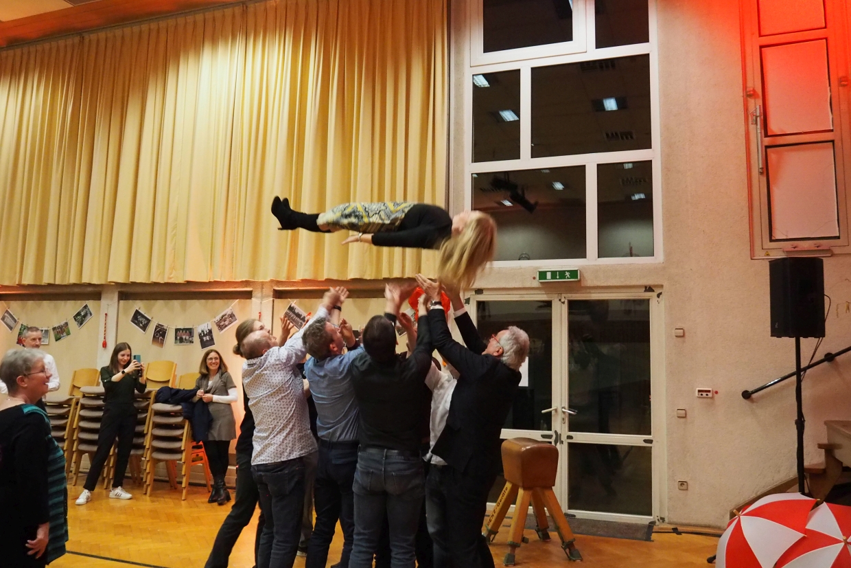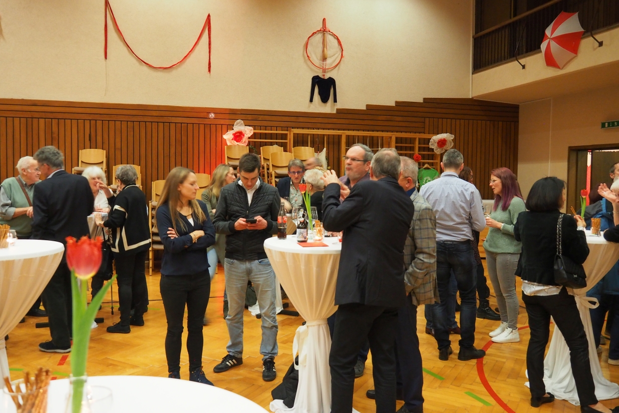 Da beim TVI die Bewegung im Vordergrund steht, riefen Sina Nägele und Jannis Noé alle Anwesenden dazu auf aufzustehen und den eigens choreografierten Jubiläumstanz mitzutanzen. Gesagt – getan. Daraufhin wurden Anja Haiber und Heinz Huber auf die Bühne gebeten, die sowohl aus ihrer jeweiligen Perspektive berichteten, was der TVI für sie bedeutet, was sie über die vielen Jahre alles im Verein erlebt hatten und wie dieser sich auch im Laufe der Zeit verändert hat. Bevor der offizielle Teil beendet wurde, zeigten verschiedene Turnerinnen und Turner in Form einer Modenschau unterschiedliche Trainingsanzüge, Vereinsshirt, Gymnastikanzüge und Outfits aus der Vergangenheit, die bis in das Jahr 1900 zurück gingen. Anschließend wurden alle Anwesend zum Umtrunk und Häppchen eingeladen, wobei Bürgermeisterin Lehnert sogar noch zu ihrer ganz eigenen „Flugstunde“ kam.
