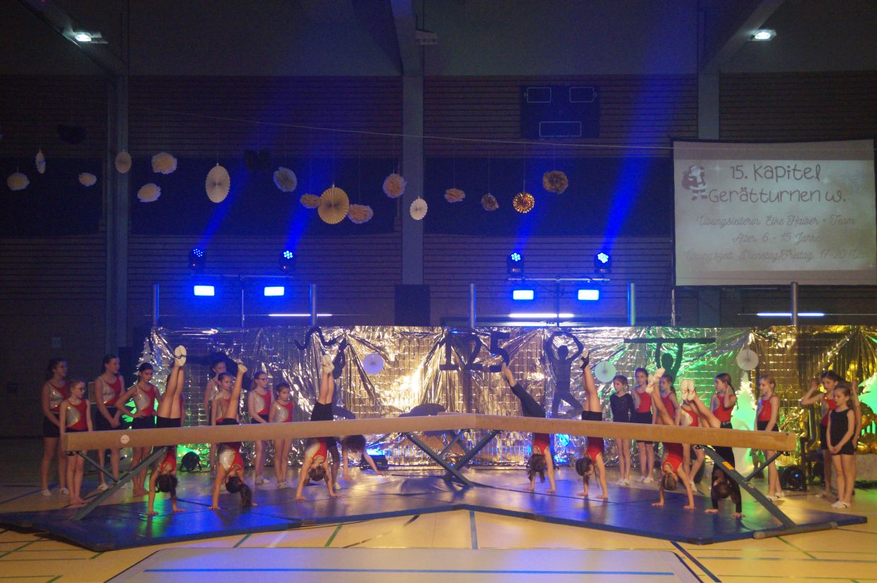 Der Weihnachtswichtel Tilda und ihr Rentier Rudolf waren mit ihrem Schlitten auf dem Weg zum Nordpol, als sie auf ein Märchenbuch stoßen, das die Geschichte eines Turnvereins aus dem Örtchen Ingersheim und dessen Suche nach dem Feuerwerk der Bewegung erzählt. Direkt waren sie in den Bann gezogen und gespannt welche Erlebnisse die einzelnen Gruppen erfahren. Das Moderatoren-Duo führte durch eine immer vielfältiger werdende Reise. Begonnen beim Eltern-Kindern-Turnen ab 1 Jahr, weiter zu den über 25 Tanzmäusen, die einen farbenfrohen Tanz zeigten. Die Pandabären, Löwen, Schmetterlinge und Eisbären bewegten sich über Kästen, mit dem Trampolin, über Bänke und zeigten, wie vielfältig man sich schon im Grundschulalter bewegen kann. Die Gruppe vom Teenssport entführte auf der Reise mit Bändern, Jonglage und Bällen in den Zirkus, die Wild Kids erzählten von Piraten-Abenteuern. Die Turnis und Pinguine sprangen mit ihren jungen Jahren schon mit dem Trampolin in Richtung Feuerwerk, bevor die Gerätturner einen Ausflug in die Anfänge des Turnens machten und Ausschnitte von altertümlichen Übungen zeigten. Als krönender Abschluss tanzte die Gruppe Moodtiamo zu einem Medley von Michael Jackson und die Gerätturnerinnen zeigten ihr Können am Balken und akrobatisch am Boden zu Music von John Miles. Geendet hat die Kinderjahresfeier mit den rund 30 ÜbungsleiterInnen und ihren Helferinnen, die gemeinsam den Jubi-Tanz zeigten, der den TVI über das gesamte Jubiläumjahr begleitete.