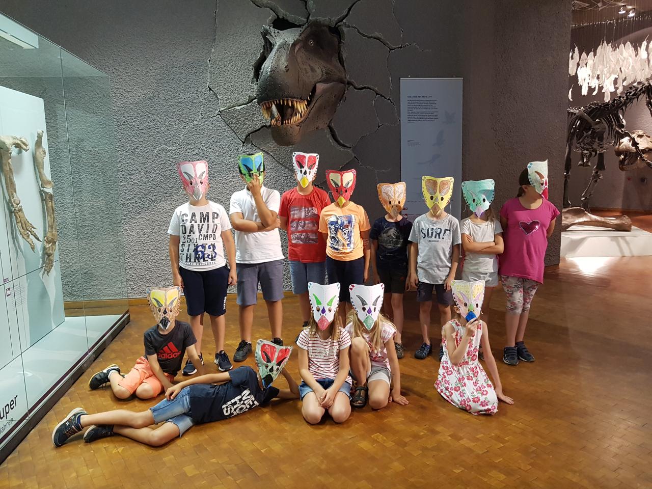 Am Freitag, 3. August 2018, machten sich 13 mutige Kinder mit ihren vier Betreuerinnen auf den Weg um mehr über (Dino)Saurier zu erfahren. Am Löwentormuseum angekommen erfuhren die Kinder zunächst einmal, welche Saurierarten in Baden-Württemberg gelebt haben und wie sich die Saurier über die Jahrmillionen verändert haben, bevor sich jedes Kind eine eigene Chasmosaurusmaske basteln durfte.