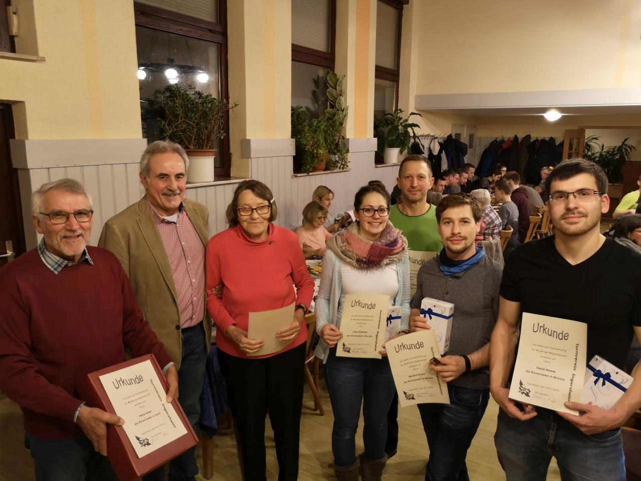 Die diesjährige Hauptversammlung des TV Ingersheim lief sehr zügig und ohne Aufreger über die Bühne. Der 1. Vorsitzende Joachim Rösch begrüßte kurz nach 20 Uhr die zahlreichen Mitglieder im großen Saal im Gasthaus Rößle in Kleiningersheim. Nachdem den verstorbenen Mitgliedern gedacht wurde, ehrte die Vorstandschaft einige langjährige Mitglieder. Für 40 Jahre erhielten die Ehrennadel in Gold Ursula Metsch und Heinz Huber. Beide waren persönlich vor Ort und nahmen ihre Präsente entgegen. Für 20 Jahre erhielten die Ehrennadel in Silber Karin Peters, Esther Vaihinger, Gerhard Hehr und Jürgen Würth. Nicole Adolph, Alisa Grözinger, Simone Klinger-Aykan, Ursula Lukacs, Isabel Otterbach, Andrea Rath, Claudine Schäfer, Michael Grösch, Daniel Nowak, Klaus Ottmar und Claus Stratmann sind seit 10 Jahren Mitglied und wurden mit der bronzenen Ehrennadel geehrt.