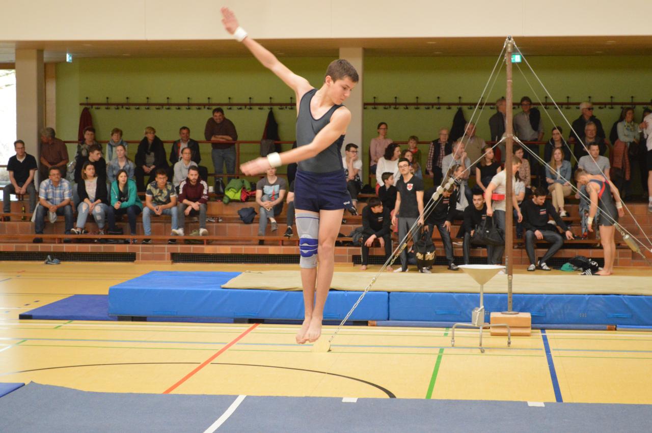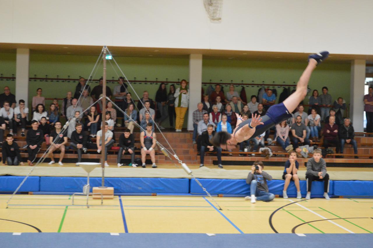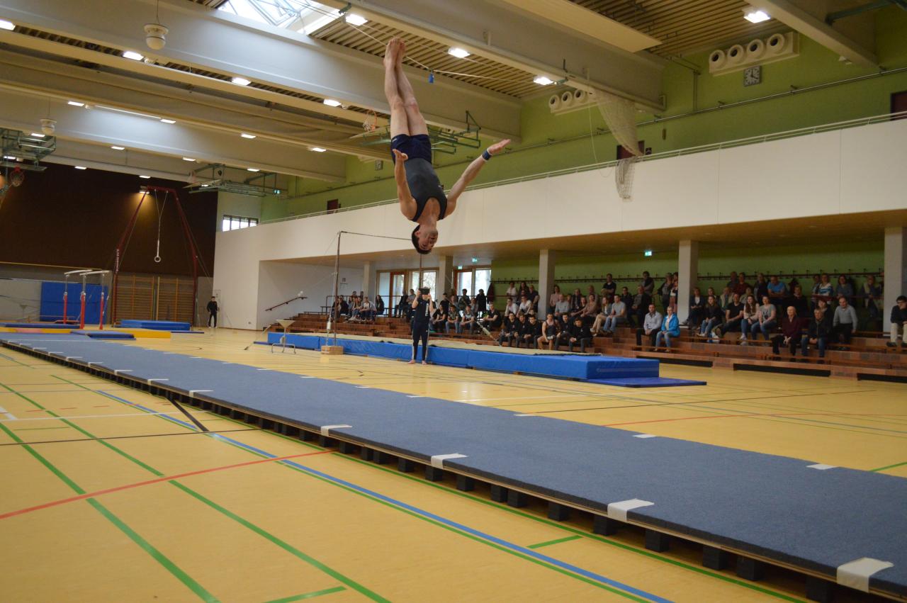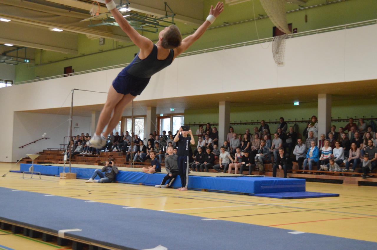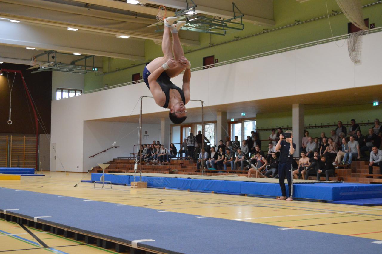 nachdem neben Jan Rubin auch Marco Vogel kurzfristig ausfiel. Hallensprecher Ralf Würth rechnete den rund 120 Zuschauern vor Wettkampfbeginn den Altersschnitt der TG vor: 20,5 Jahre, an eine so junge Mannschaft konnte sich keiner erinnern. Die junge TG startete extrem stark und fokussiert am Boden. Timo Kögele (12,1 Punkte), Patrick Nägele (11,95), Jannis Noé (11,5) und Daniel Nowak (11,2) kamen ohne Patzer durch ihre Übungen und kämpften um jeden Stand bei der Landung. So gewann das Heimteam den Boden mit 46,75:43,55 Punkten. Am Pauschenpferd zeigte sich die TG stark verbessert, nur Nägele musste das Gerät verlassen. Pascal Würth war mit 9,0 Punkten bester TG’ler. Die erfahrenen Gäste zeigten starke Übungen, gewannen das Gerät mit 6,6 Punkten und übernahmen die Führung. Die Ringe gingen mit 44,8 zu 41,45 Punkten an die WKG, Michael Grösch erhielt 11,65 Punkte und damit die höchste TG-Wertung. Nach der Pause überzeugte die Bulling-Riege mit sauberen Überschlägen. Jonas Klein stellte seinen Handstütz-Überschlag auch zum zweiten Mal in Folge in den Stand (10,85 Punkte), auch Kögele (10,55), Würth (10,45) und Nowak (10,35) erhielten eine höhere Wertung als der beste Sprung der Gäste.