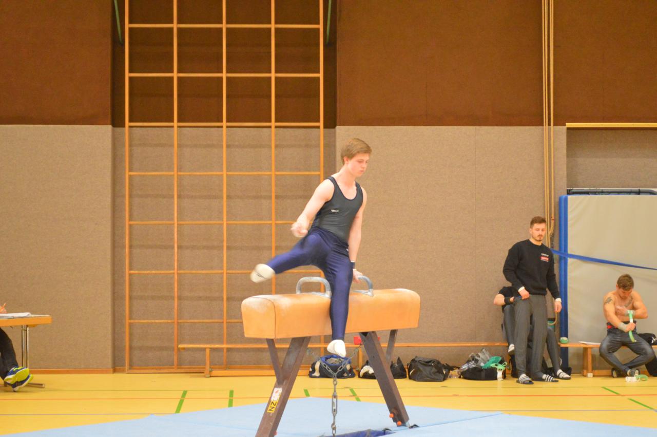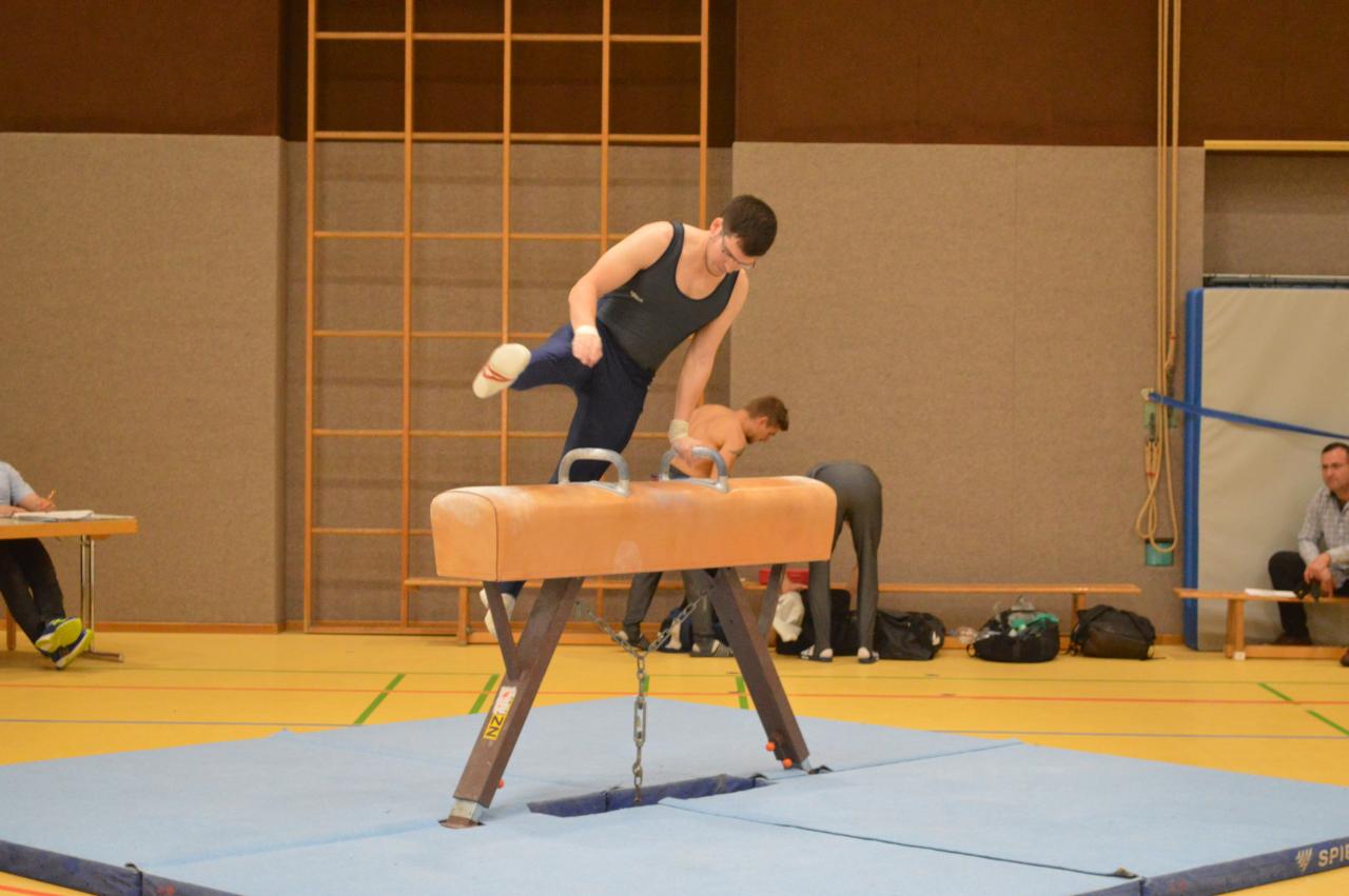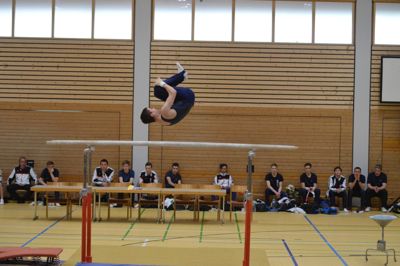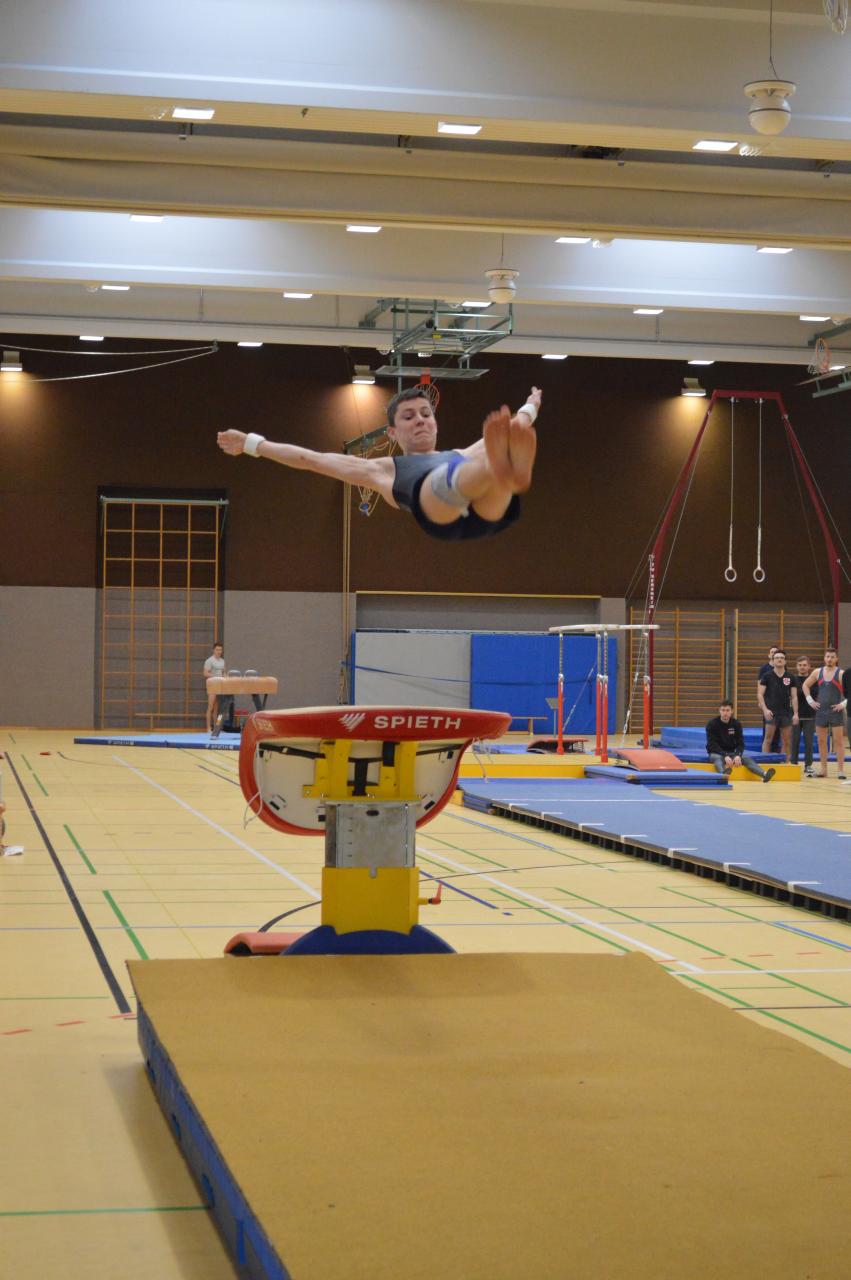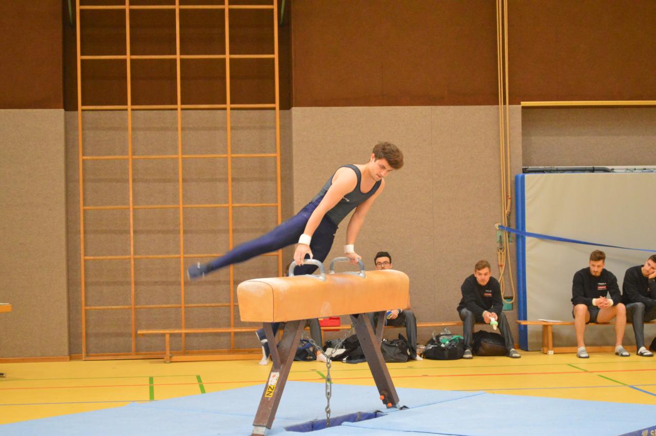 nachdem neben Jan Rubin auch Marco Vogel kurzfristig ausfiel. Hallensprecher Ralf Würth rechnete den rund 120 Zuschauern vor Wettkampfbeginn den Altersschnitt der TG vor: 20,5 Jahre, an eine so junge Mannschaft konnte sich keiner erinnern. Die junge TG startete extrem stark und fokussiert am Boden. Timo Kögele (12,1 Punkte), Patrick Nägele (11,95), Jannis Noé (11,5) und Daniel Nowak (11,2) kamen ohne Patzer durch ihre Übungen und kämpften um jeden Stand bei der Landung. So gewann das Heimteam den Boden mit 46,75:43,55 Punkten. Am Pauschenpferd zeigte sich die TG stark verbessert, nur Nägele musste das Gerät verlassen. Pascal Würth war mit 9,0 Punkten bester TG’ler. Die erfahrenen Gäste zeigten starke Übungen, gewannen das Gerät mit 6,6 Punkten und übernahmen die Führung. Die Ringe gingen mit 44,8 zu 41,45 Punkten an die WKG, Michael Grösch erhielt 11,65 Punkte und damit die höchste TG-Wertung. Nach der Pause überzeugte die Bulling-Riege mit sauberen Überschlägen. Jonas Klein stellte seinen Handstütz-Überschlag auch zum zweiten Mal in Folge in den Stand (10,85 Punkte), auch Kögele (10,55), Würth (10,45) und Nowak (10,35) erhielten eine höhere Wertung als der beste Sprung der Gäste.