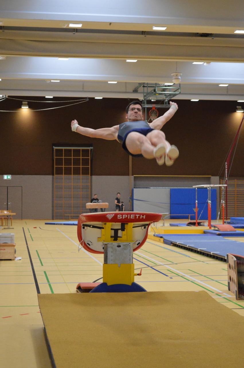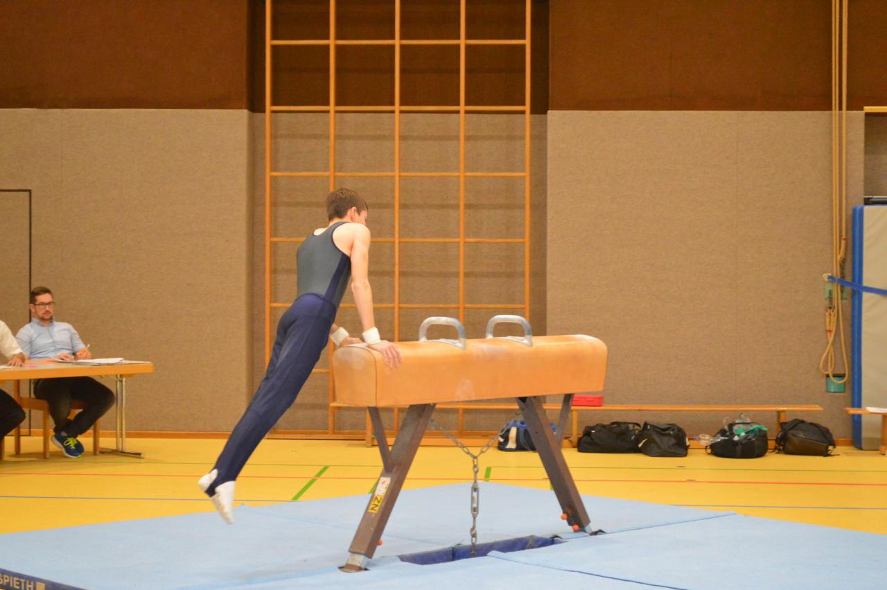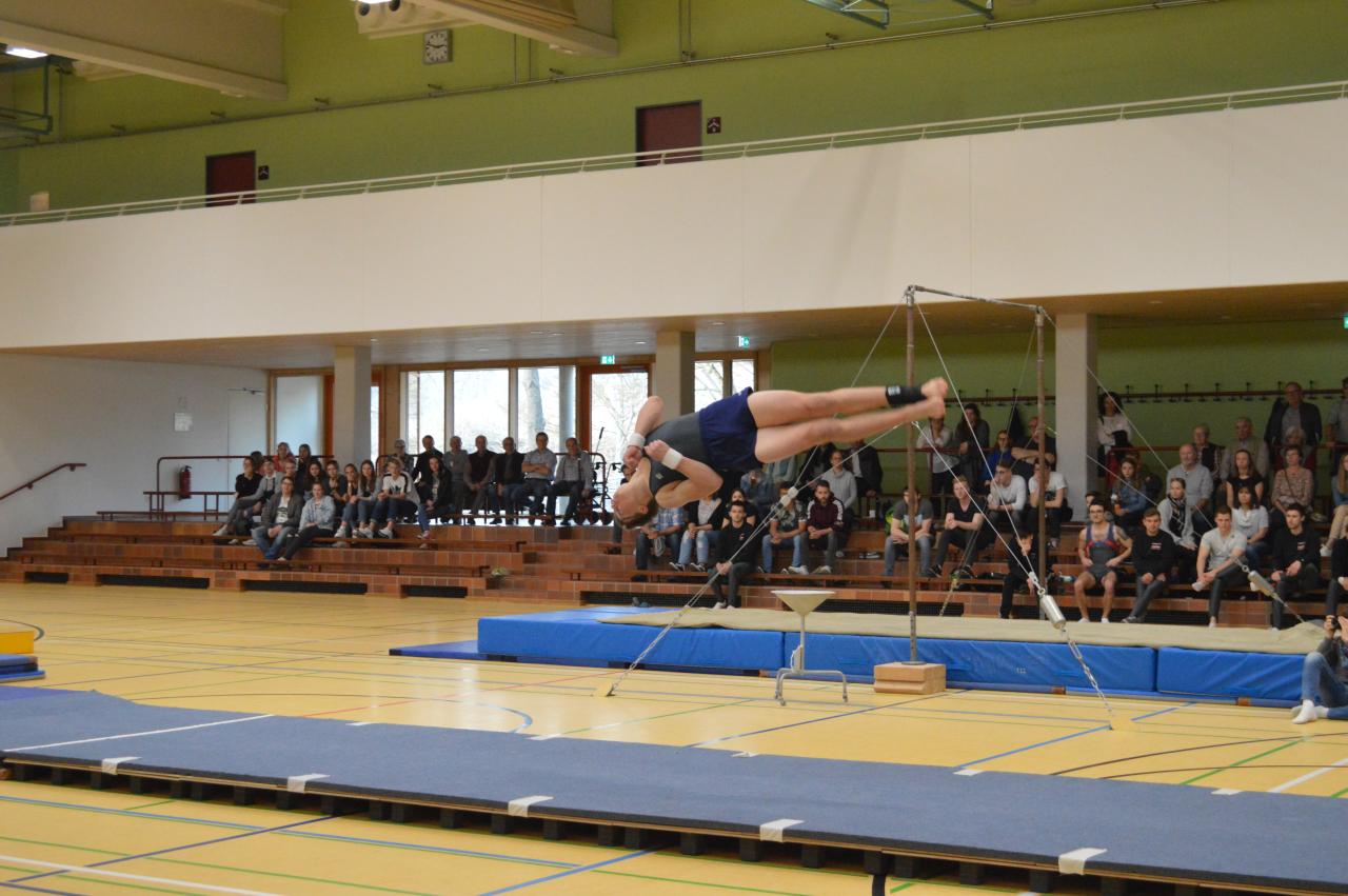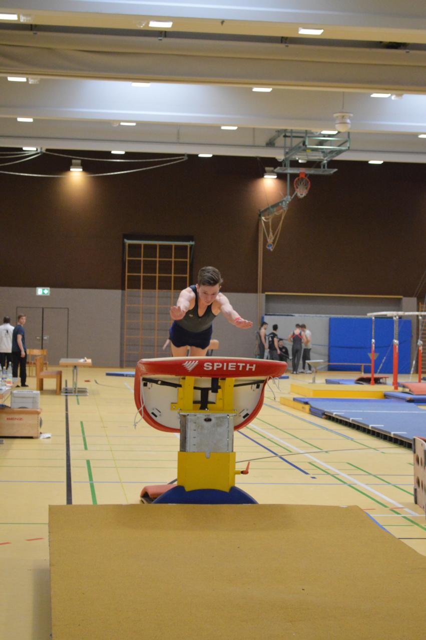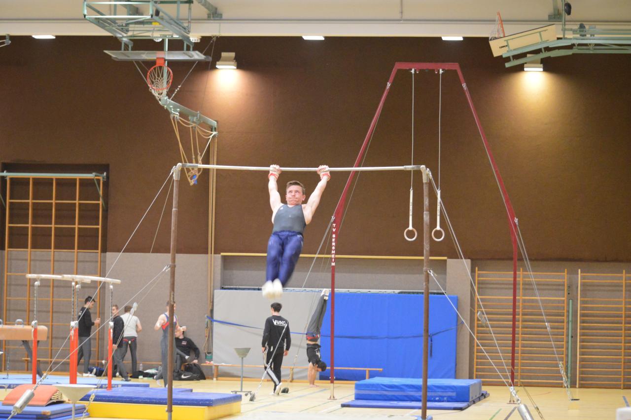 nachdem neben Jan Rubin auch Marco Vogel kurzfristig ausfiel. Hallensprecher Ralf Würth rechnete den rund 120 Zuschauern vor Wettkampfbeginn den Altersschnitt der TG vor: 20,5 Jahre, an eine so junge Mannschaft konnte sich keiner erinnern. Die junge TG startete extrem stark und fokussiert am Boden. Timo Kögele (12,1 Punkte), Patrick Nägele (11,95), Jannis Noé (11,5) und Daniel Nowak (11,2) kamen ohne Patzer durch ihre Übungen und kämpften um jeden Stand bei der Landung. So gewann das Heimteam den Boden mit 46,75:43,55 Punkten. Am Pauschenpferd zeigte sich die TG stark verbessert, nur Nägele musste das Gerät verlassen. Pascal Würth war mit 9,0 Punkten bester TG’ler. Die erfahrenen Gäste zeigten starke Übungen, gewannen das Gerät mit 6,6 Punkten und übernahmen die Führung. Die Ringe gingen mit 44,8 zu 41,45 Punkten an die WKG, Michael Grösch erhielt 11,65 Punkte und damit die höchste TG-Wertung. Nach der Pause überzeugte die Bulling-Riege mit sauberen Überschlägen. Jonas Klein stellte seinen Handstütz-Überschlag auch zum zweiten Mal in Folge in den Stand (10,85 Punkte), auch Kögele (10,55), Würth (10,45) und Nowak (10,35) erhielten eine höhere Wertung als der beste Sprung der Gäste.