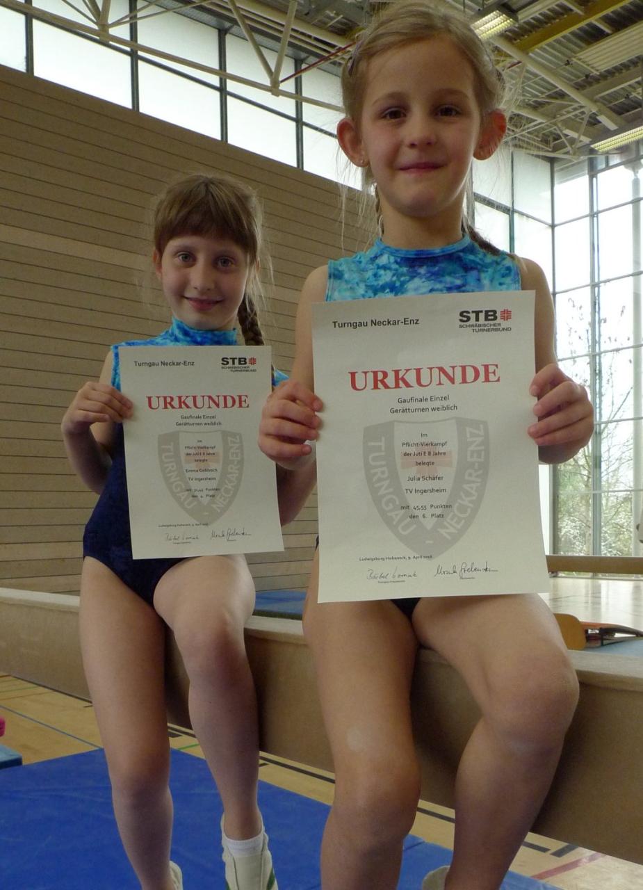 Am Sonntag, den 9. April fanden in Ludwigsburg-Hoheneck die Gaueinzelmeisterschaften weiblich vom Turngau Neckar-Enz statt. In der E-Jugend (8-9 Jahre) wurden am Boden, Sprung, Reck und Schwebebalken Pflichtübungen geturnt, zeitgleich turnten ältere Turnerinnen Kürübungen.