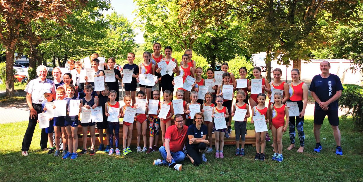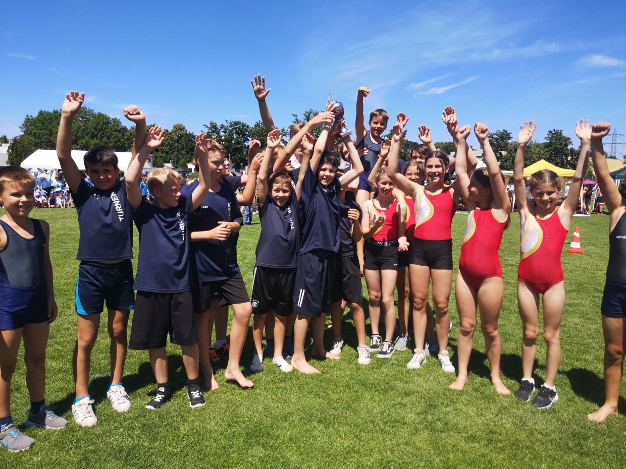 Sowohl die Turnmaxis als auch die Gerätturnerinnen und -turner gewinnen ihre Vereinsstaffel und kommen vom Wochenende mit strahlenden Gesichtern und je einem Pokal im Gepäck nach Hause.