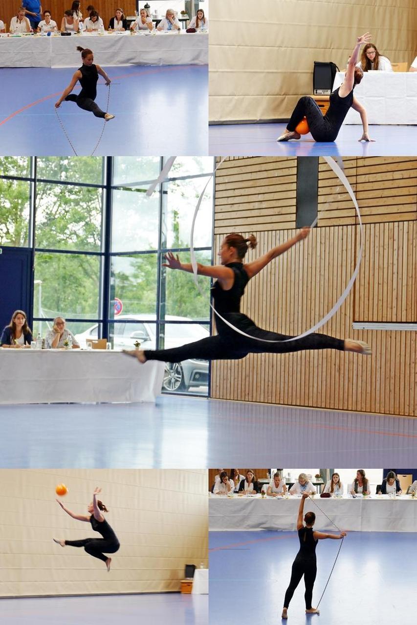 Leider konnte Fabienne aufgrund einer Knieverletzung nicht an den Start gehen. Umso mehr feuerte sie Vorort ihre Vereinskollegin Jennifer bei ihren Pflichtübungen mit dem Seil, Ball und Band in der höchsten Schwierigkeitsstufe P9 an. Nach einer gelungenen Seilübung musste Jennifer kleinere Fehler bei der Geräteausführung mit dem Ball in Kauf nehmen, welche sie durch gute Leistungen im Band ausglich. Jennifer Happold erkämpfte sich unter 13 Gymnastinnen in der Altersklasse Frauen 18+ den dritten Platz. Starke Übungen zeigten die Siegerin Sophia Kistermann von der DJK-SG Ebingen e.V. und die Zweitplatzierte Anna-Lena Schubert, SV 1845 Esslingen e.V.